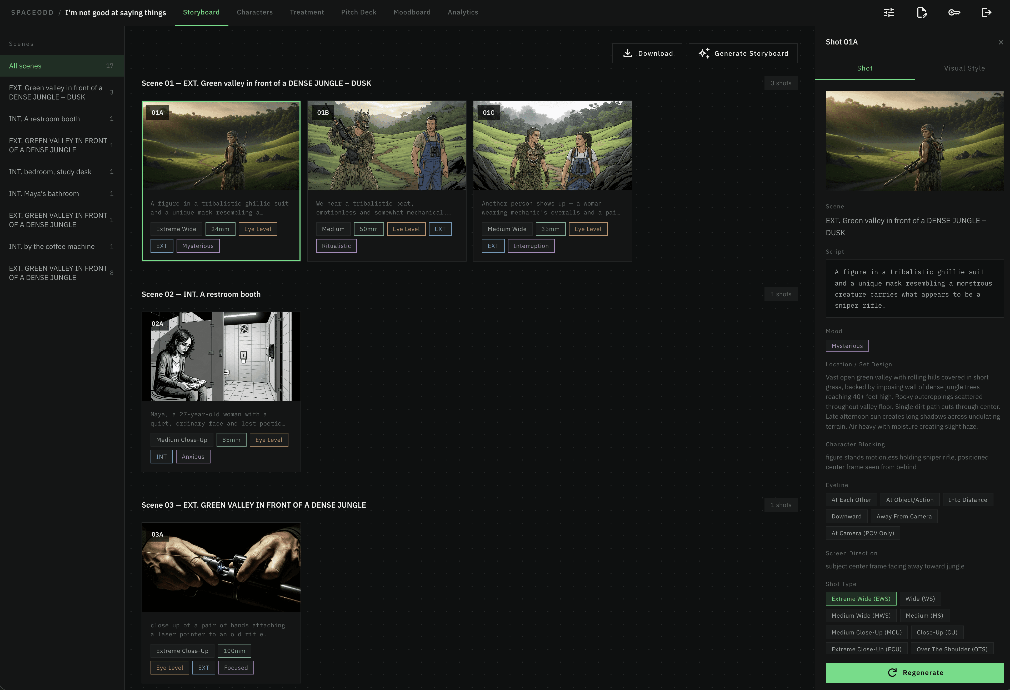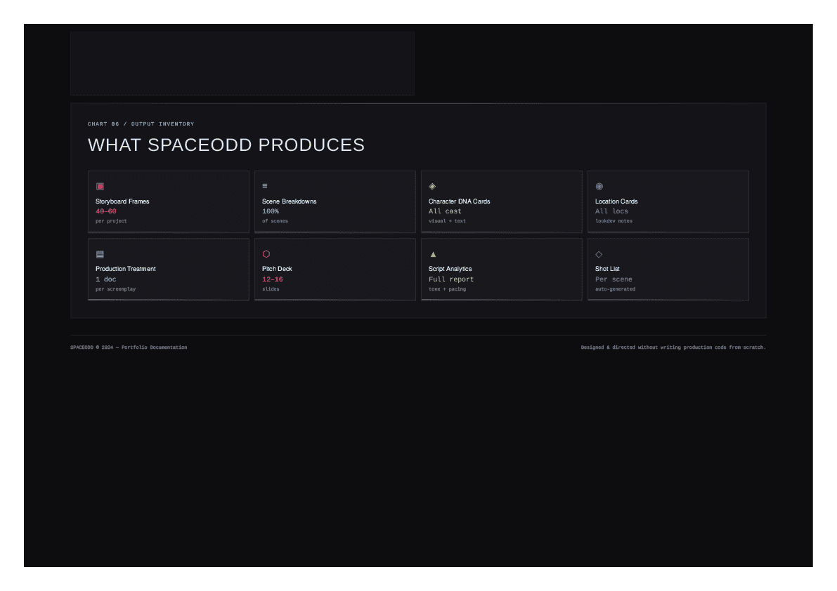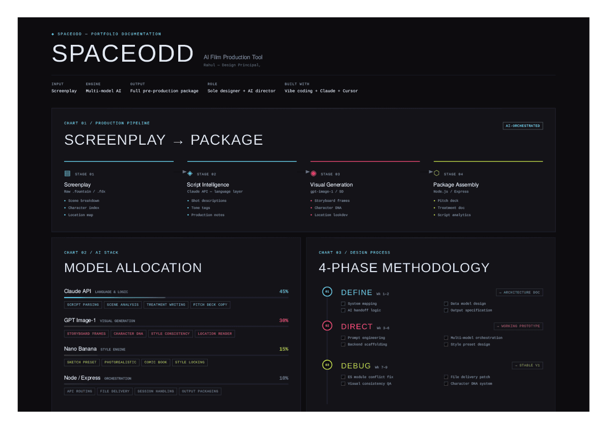 SPACEODD is a web app that takes a screenplay and generates a full film production package, including shot breakdowns, storyboard panels, character analysis, elevator pitch, and production notes, all powered by AI. This is my very own project with my very own concept, arising from my own need as an independent filmmaker. Beta live at www.spaceodd.com